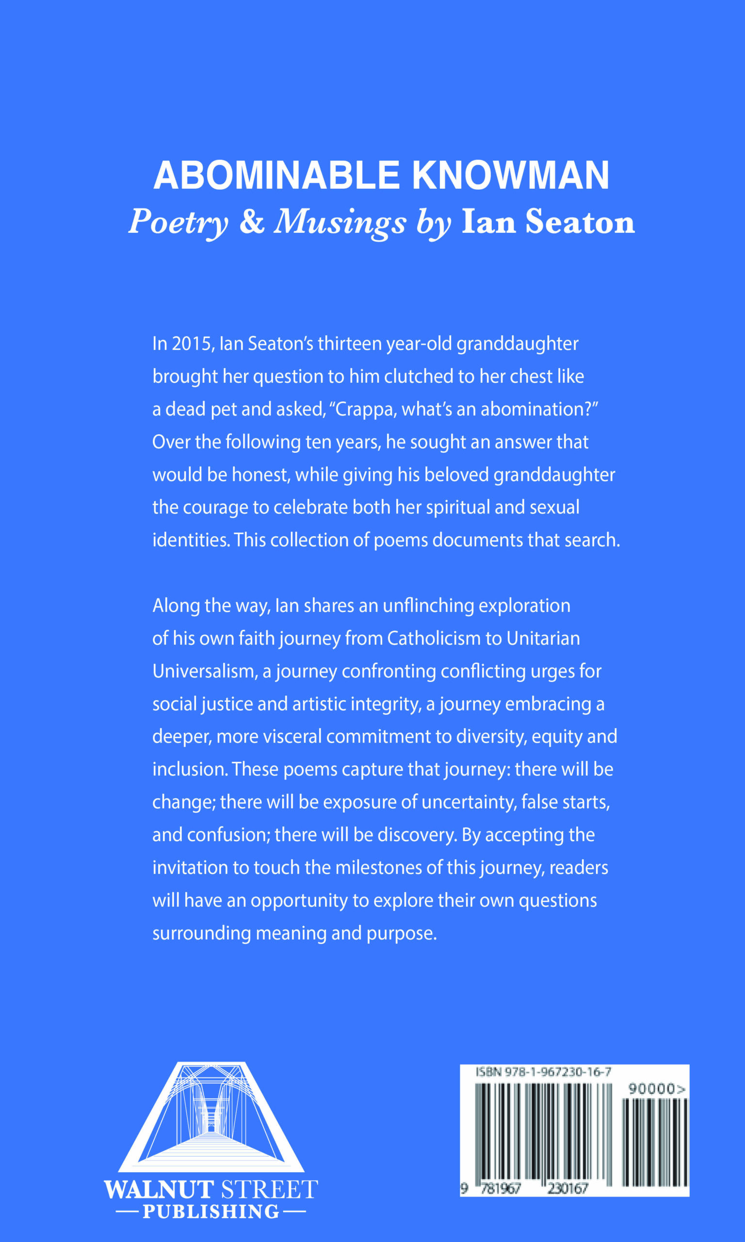 In 2015, Ian Seaton’s thirteen year-old granddaughter brought her question to him clutched to her chest like a dead pet and asked, “Crappa, what’s an abomination?” Over the following ten years, he sought an answer that would be honest, while giving his beloved granddaughter the courage to celebrate both her spiritual and sexual identities. This collection of poems documents that search.
